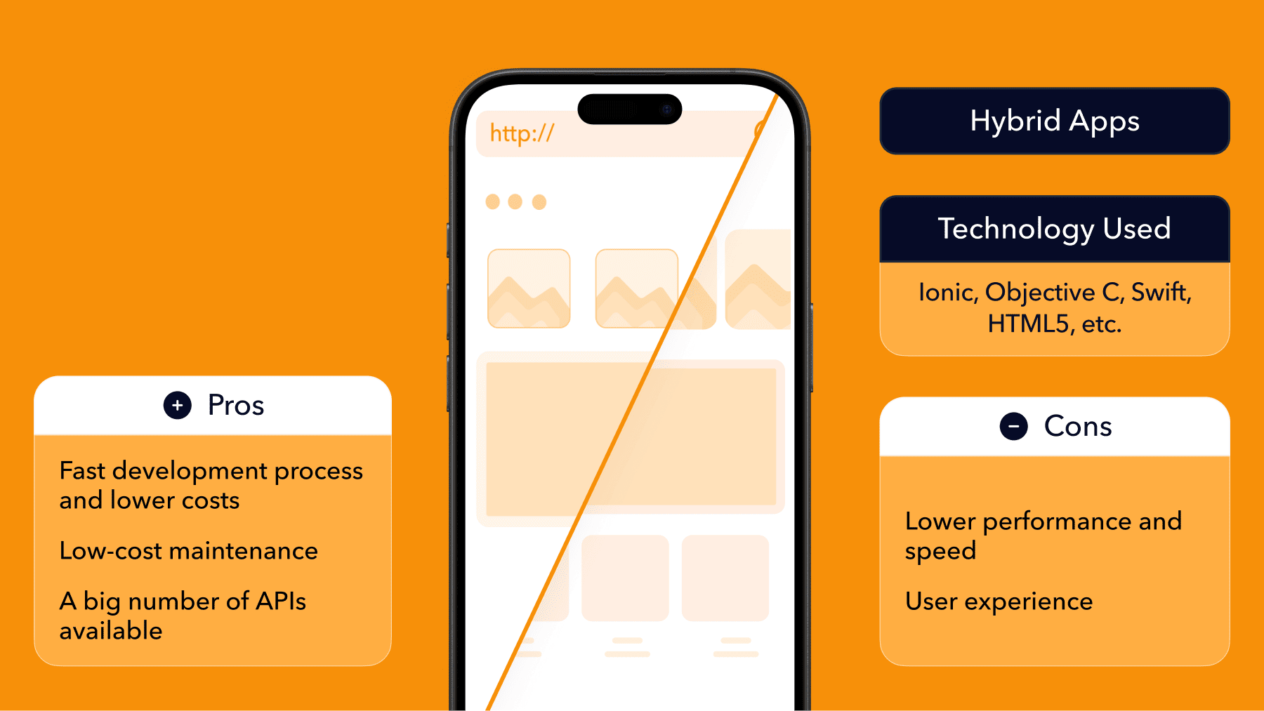 - Compared to native apps, hybrid apps often allow more code sharing across iOS and Android, but you may still face performance and integration trade-offs.