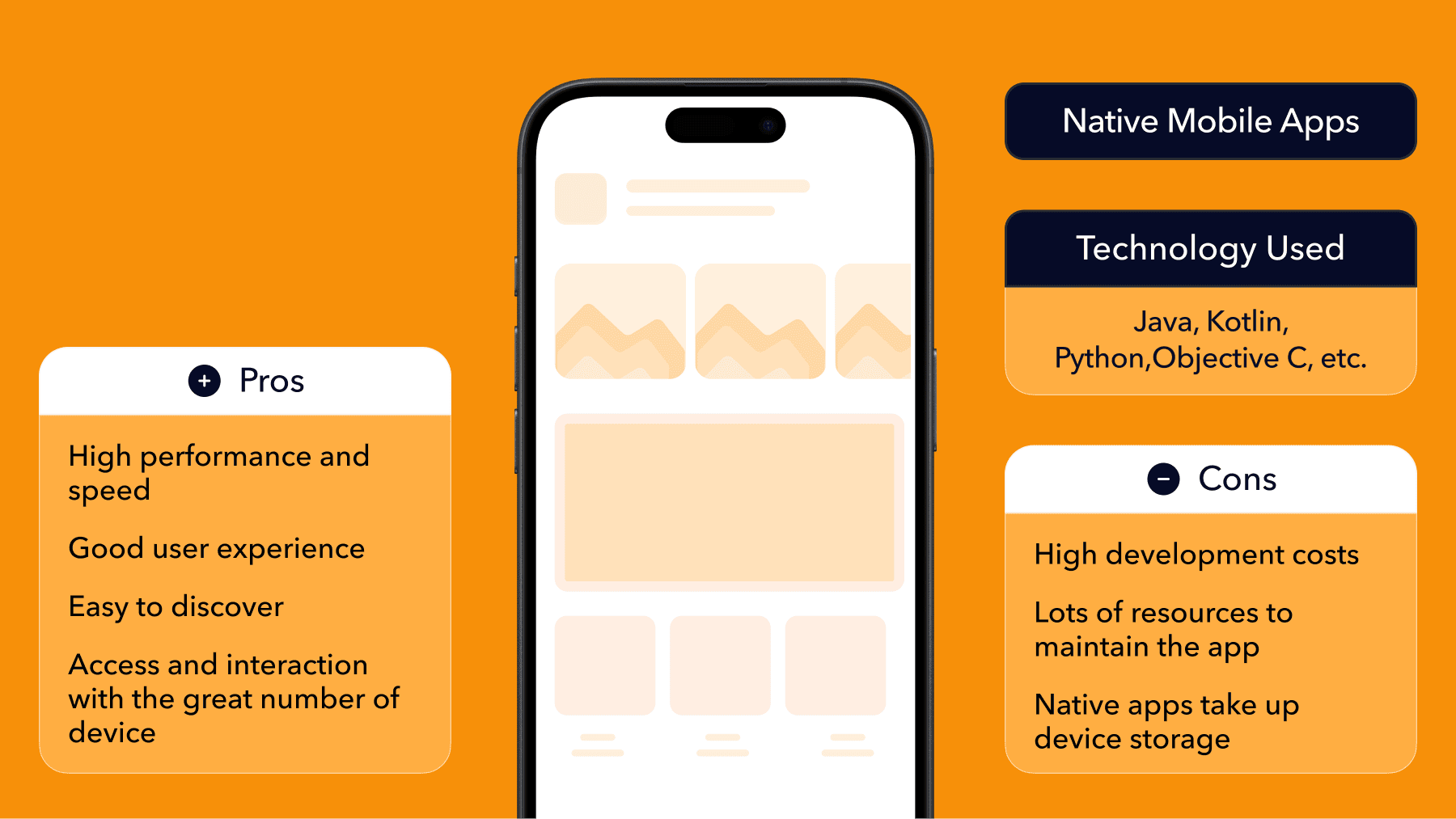 - Native apps are built specifically for iOS or Android using platform-native tools.