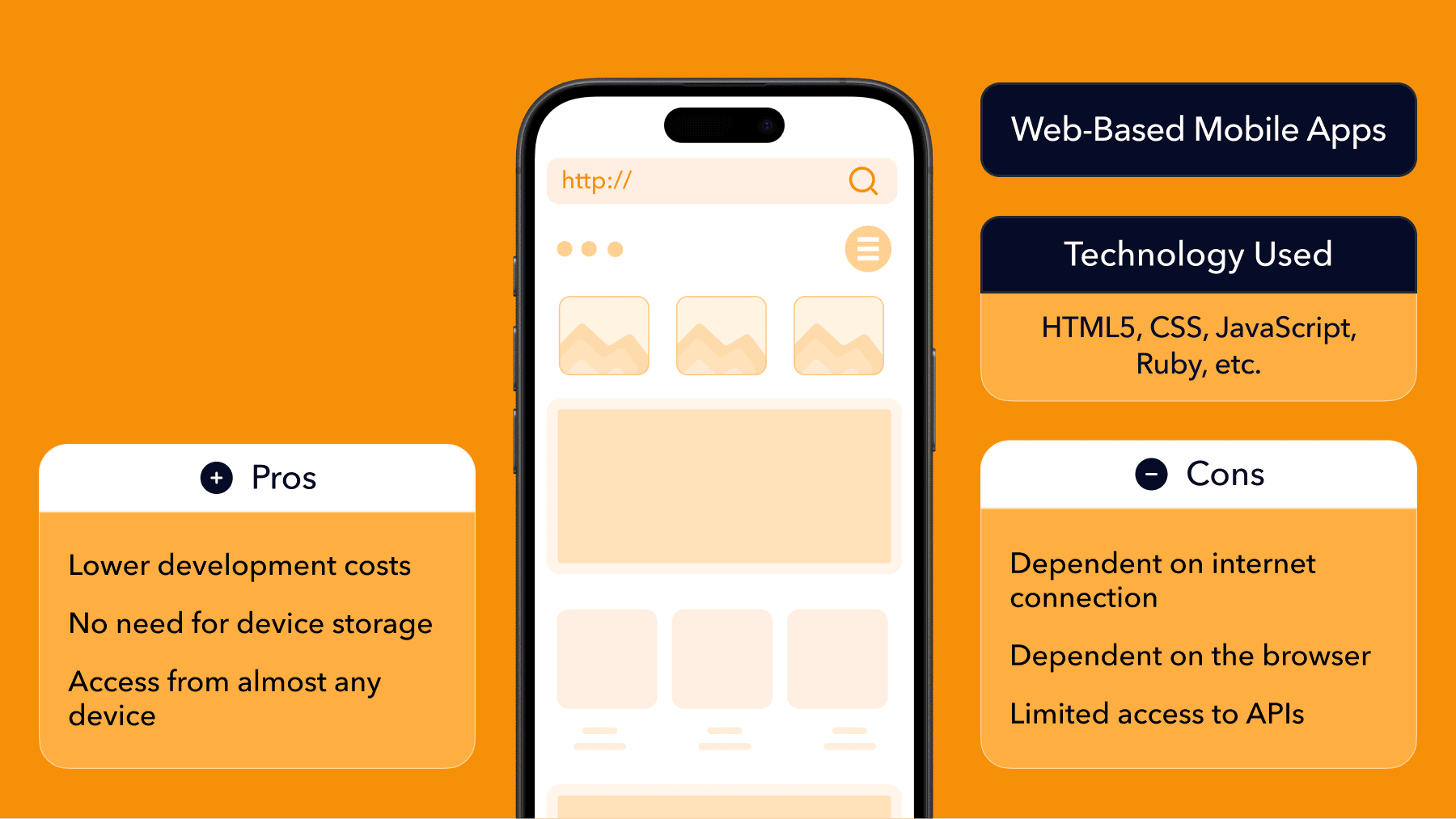 - Web apps run in a mobile browser and are accessed through a URL.