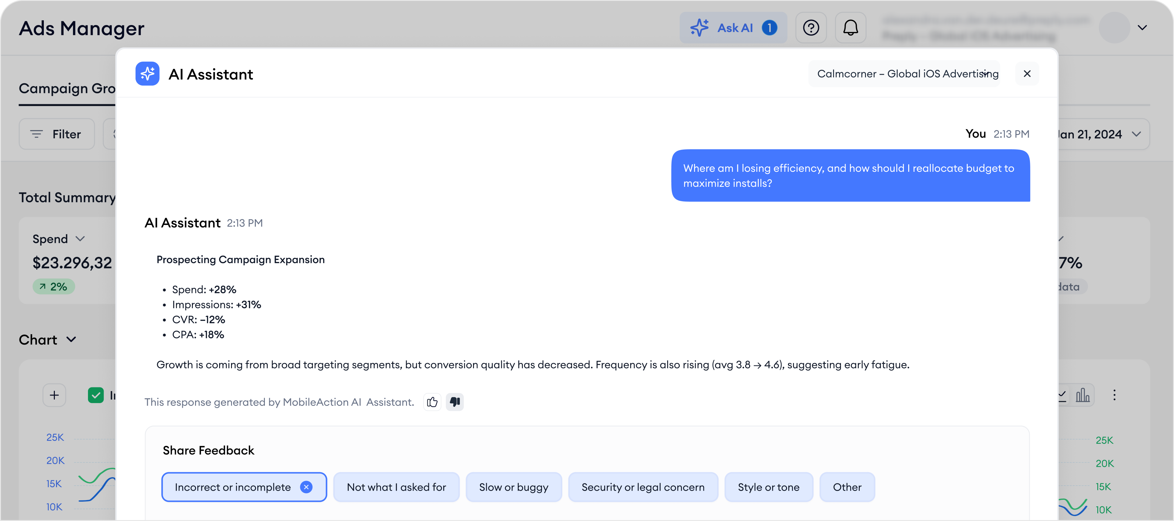 Run AI powered optimization inside MobileAction infrastructure with your data isolated and no exposure to external public models.