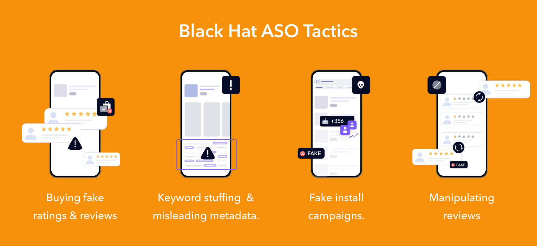 Let’s break down some of the most common black hat tactics in app store optimization. These are practices you should avoid at all costs, even if you see competitors trying them. Not only do these techniques violate Apple’s and Google’s policies, but they can also result in severe penalties if you get caught. Common black hat ASO tactics include: