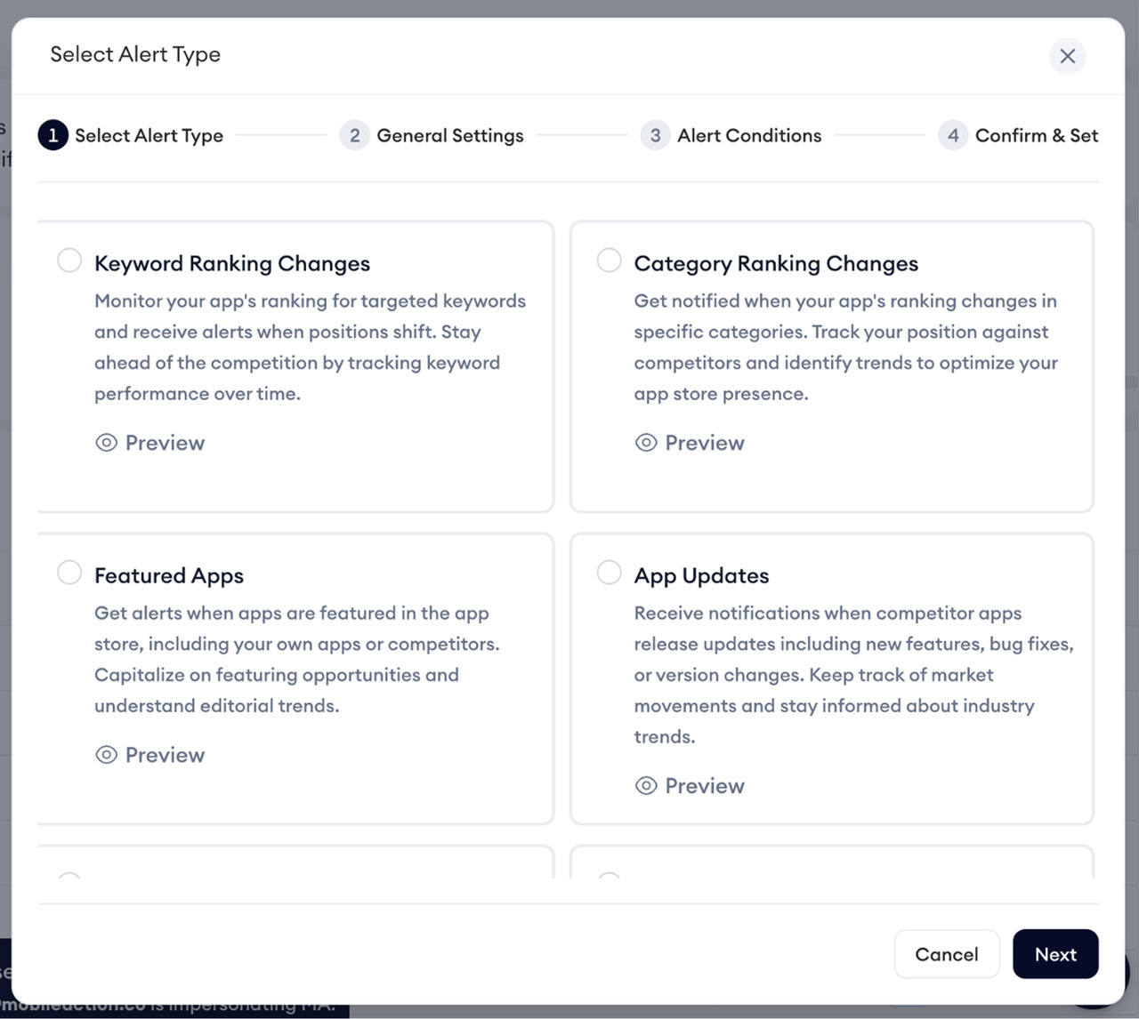 Alerts can only be created for apps already in your tracked list. While this may feel like a limitation at first, it creates a much more consistent monitoring experience by keeping alerts aligned with your active workspace. Category- and publisher-level alerts have been removed in favor of app-level tracking, allowing for more precise and relevant signals.Â