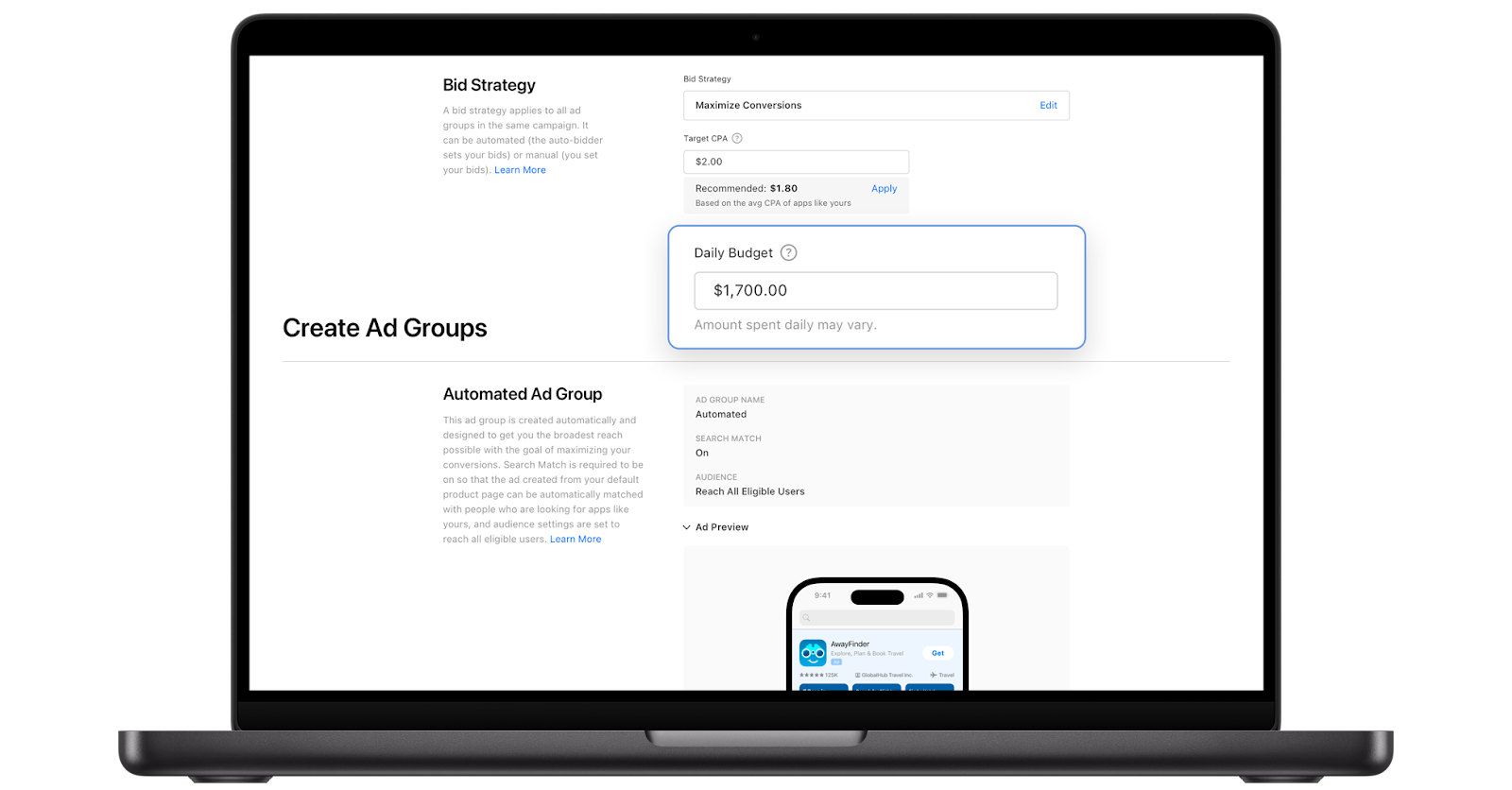 Maximize Conversions uses daily budget as the campaign’s primary spend control. Apple Ads frames it as a monthly pacing mechanism, which is why you may spend more than the daily amount on certain days and less on others, while still staying within a monthly limit.