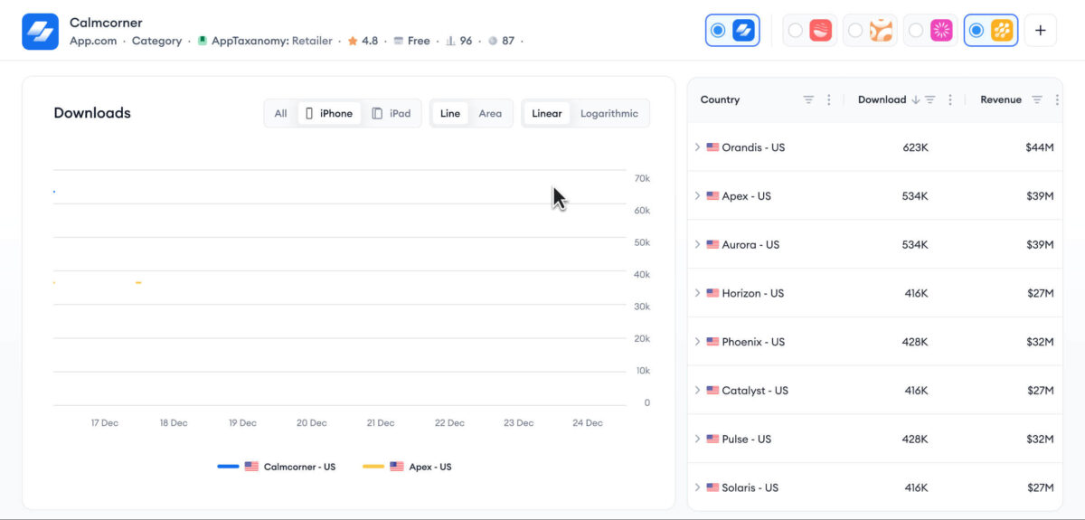 With MobileAction’s Market Intelligence, you can compare downloads, revenue, and rankings across different apps and countries to understand how your ASO performance fits into the broader market.