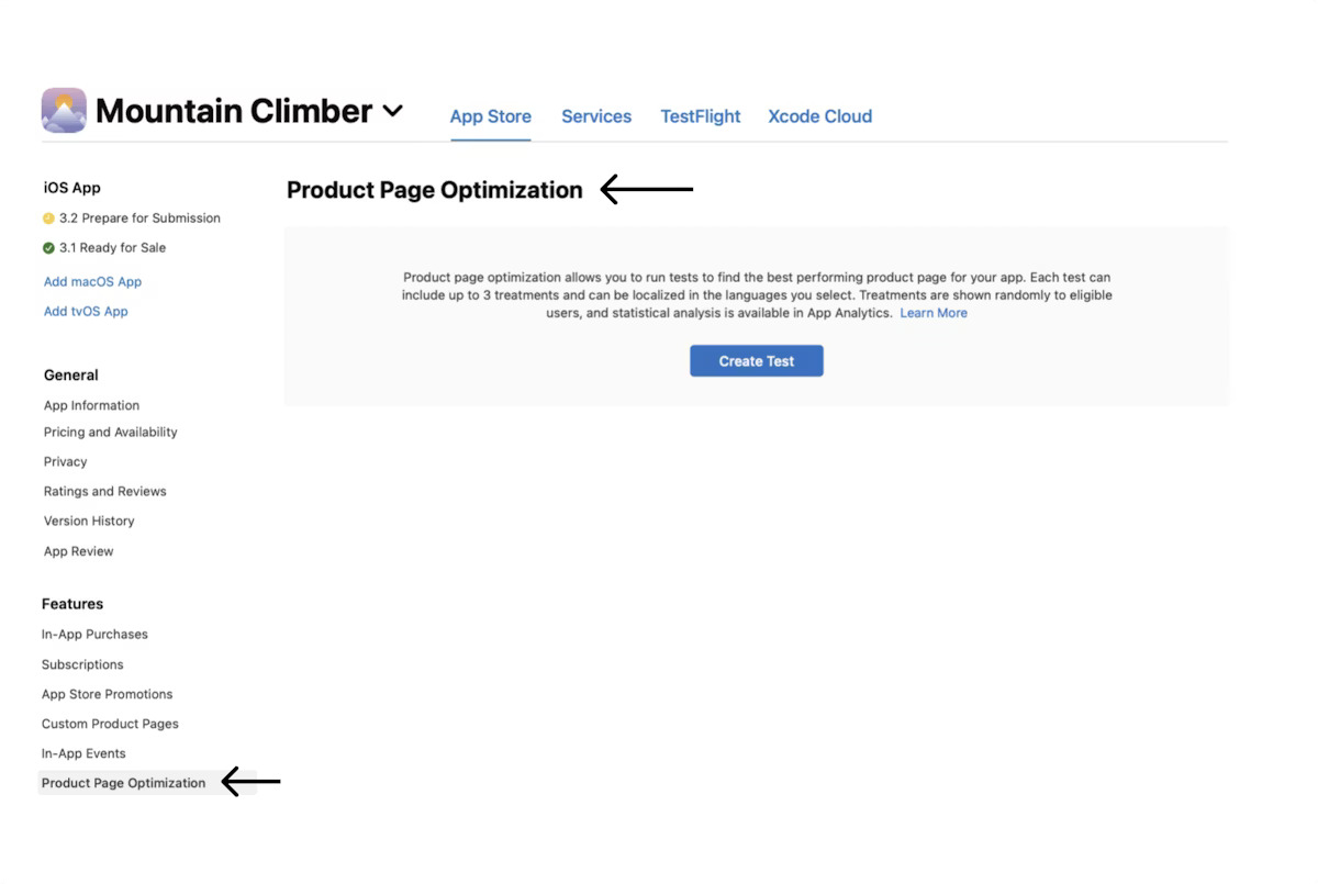 Creating your first product page optimization test in App Store Connect follows a clear sequence: you confirm eligibility, set up the test shell, and then configure your treatments (variants).Â