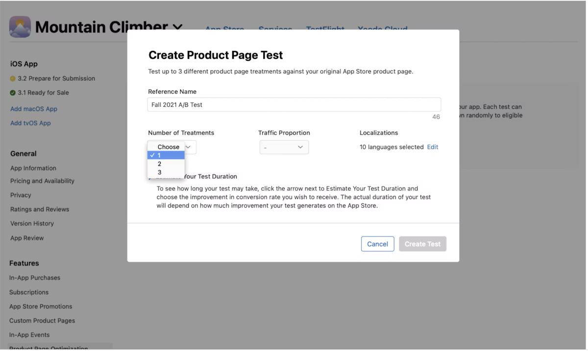 When you create a product page optimization test, Apple lets you set up to three treatments. Apple clearly notes that the more treatments you add, the longer the test may take to reach a conclusive result.Â