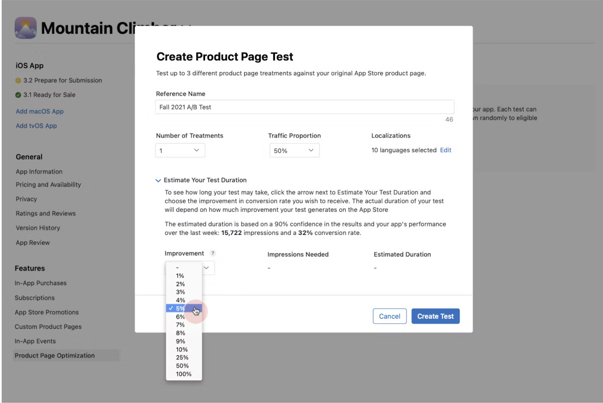 If you include many localizations (languages/countries) in your test, the data for each market will be smaller. Apple warns that choosing many localizations can increase the time required to reach meaningful results.