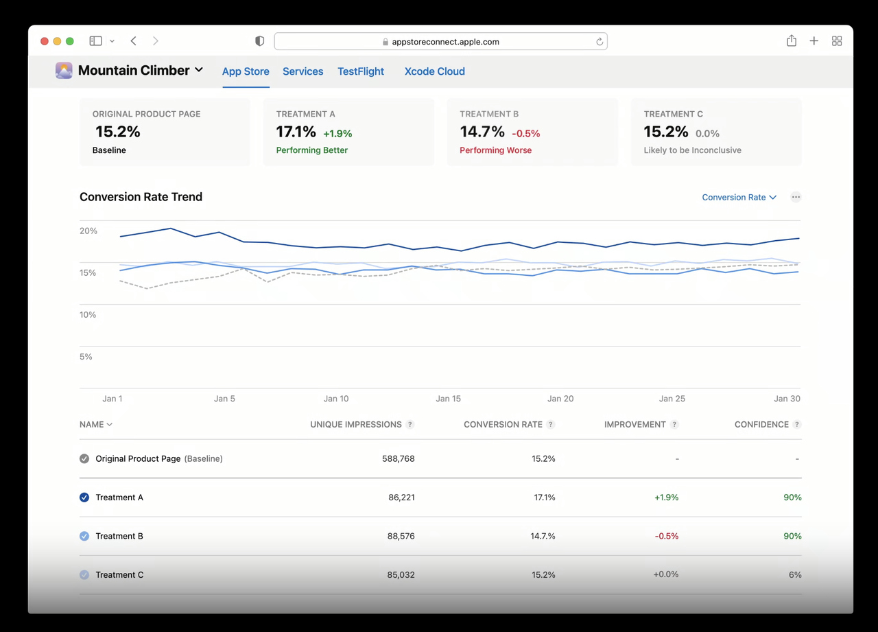 - If Apple warns that the test may not reach significance with current traffic, consider changing future tests (for example, fewer treatments or more traffic).