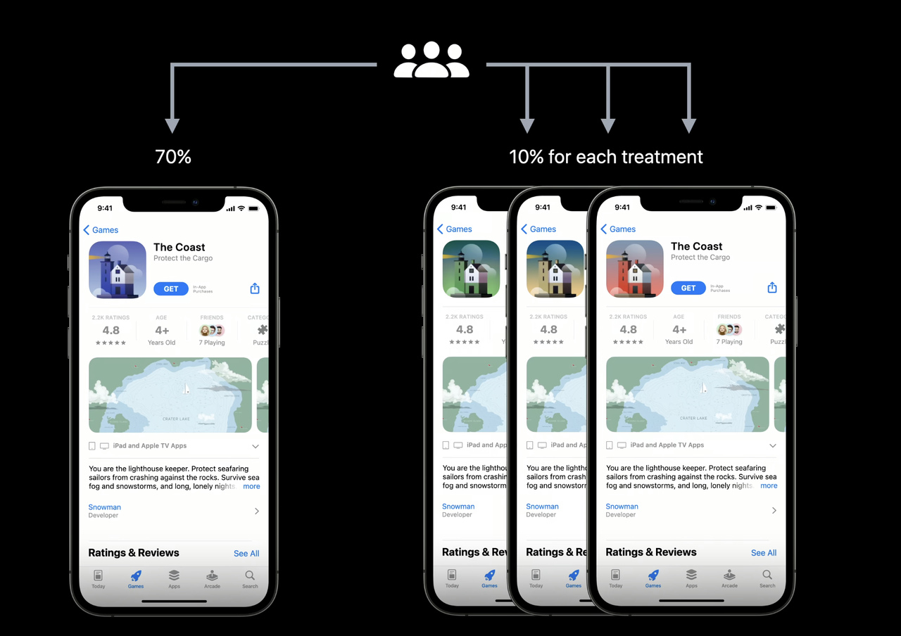 In App Store Connect, you choose a traffic proportion for your test. This defines what percentage of users will see test treatments instead of the original product page. If you set 30% with three treatments, each treatment gets 10% of total traffic.