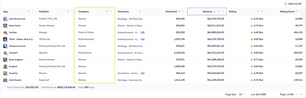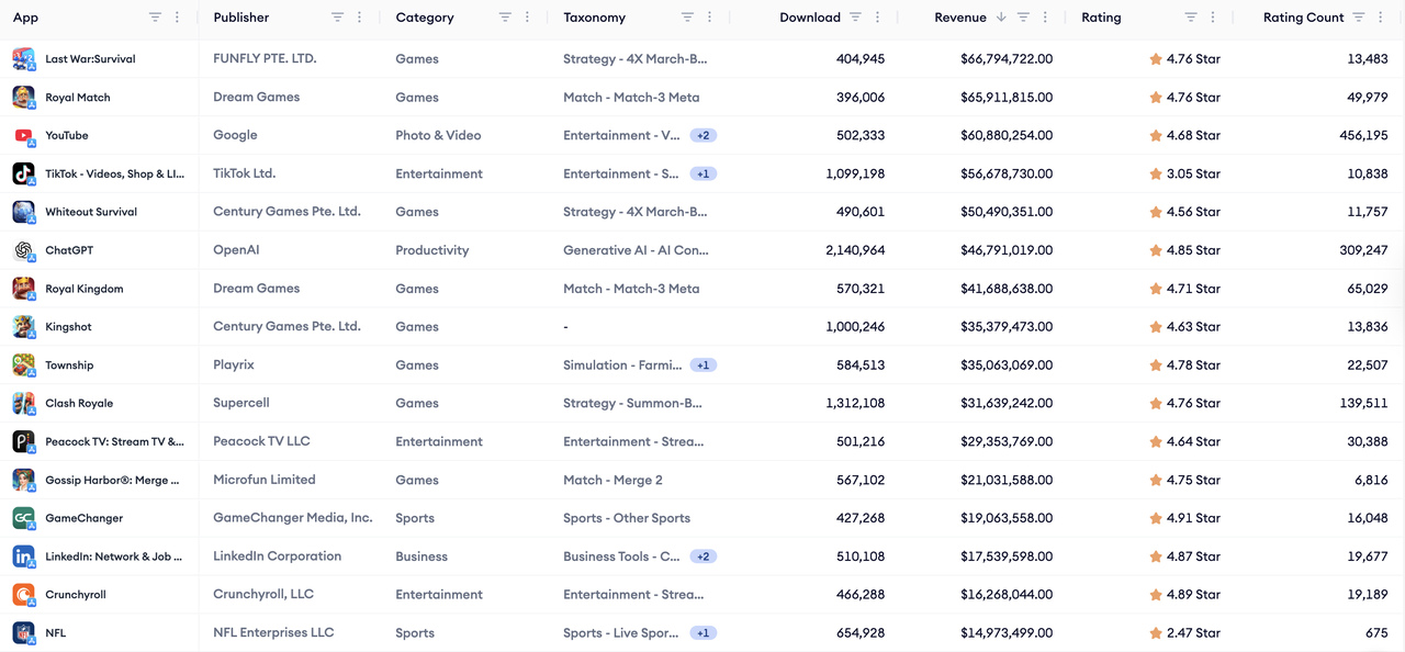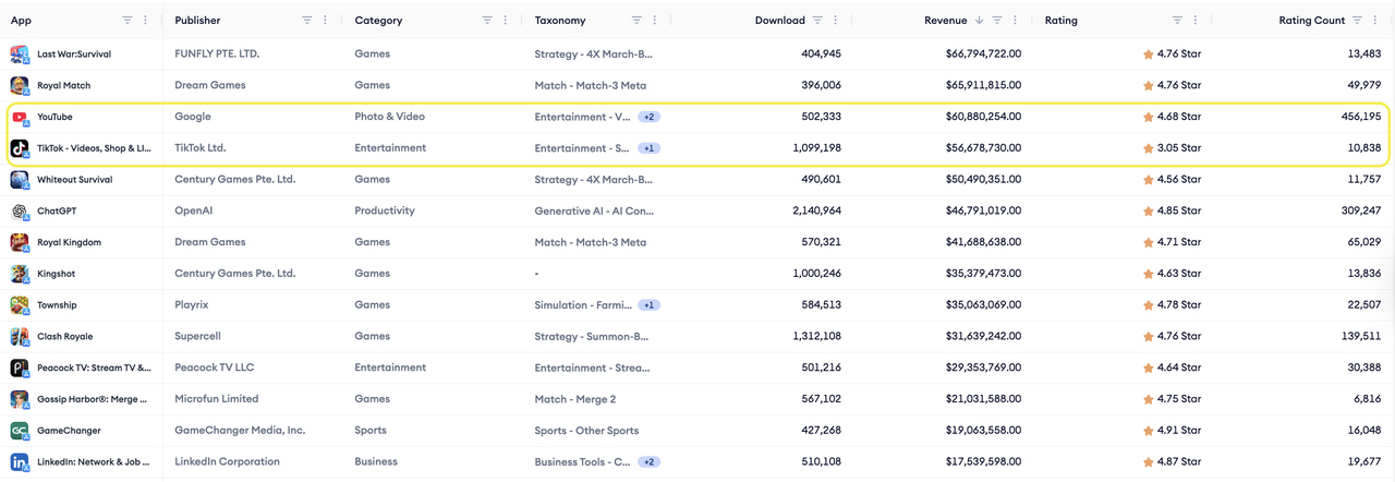 This pattern is clearly visible in MobileAction’s Market Intelligence → Top Apps when the table is filtered by Revenue. In this view, large content platforms such as YouTube and TikTok appear among the highest-earning apps, despite offering free core experiences and not consistently leading download rankings.