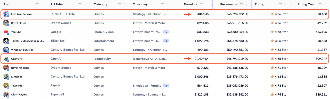 ✴️ Pro tip: That’s the core lesson; 5x more downloads does not guarantee more revenue. If you’re researching the most profitable apps, this is exactly the signal to look for.