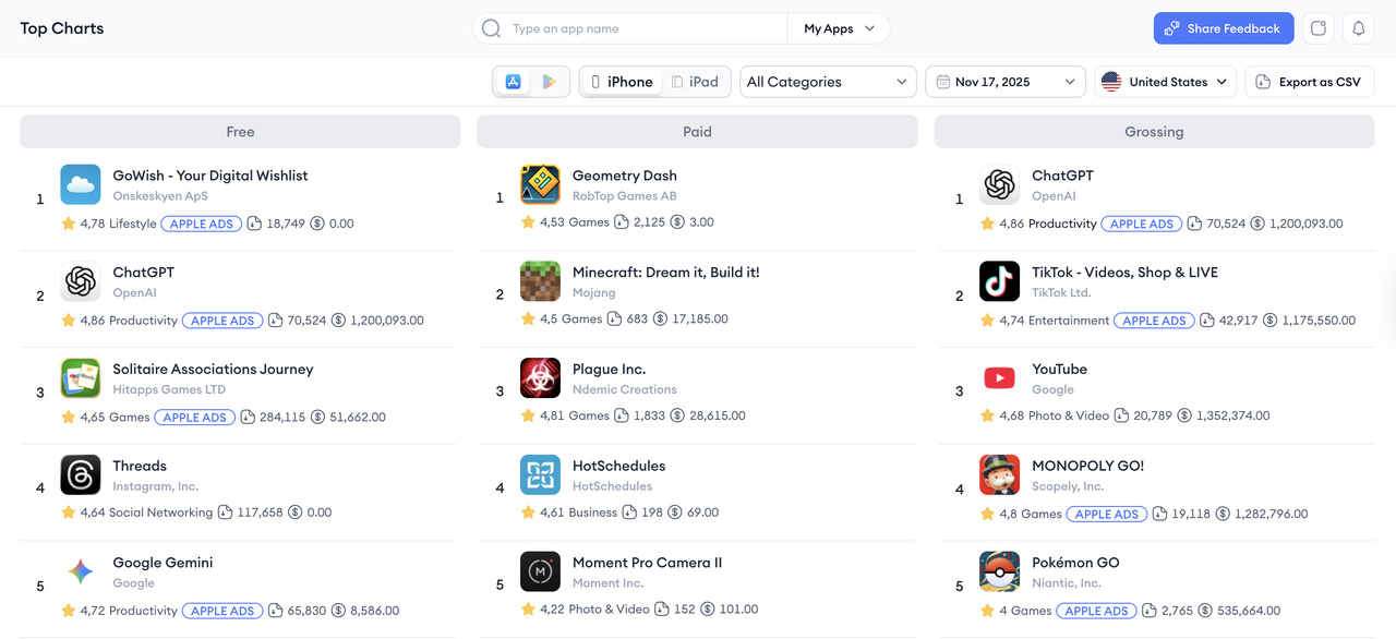 These mistakes are visible indirectly in the gap between free and grossing charts. Many apps achieve visibility but never cross the threshold into sustainable revenue.